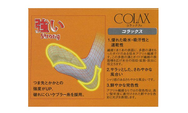 メーカー希望小売価格はメーカーカタログに基づいて掲載しています 仕様・規格 ●素材:アクリル、ナイロン、ポリウレタン●サイズ:一般:24-27、26-29●カラー:エンジ、Dグリーン、ロイヤルブルー、Dネイビー、ブラック、レッド●メーカー品番:C876<優れた吸水・吸汗性と速乾性>繊維一本一本の表面に、多数の溝をもったボイドのある吸水アクリル繊維です。